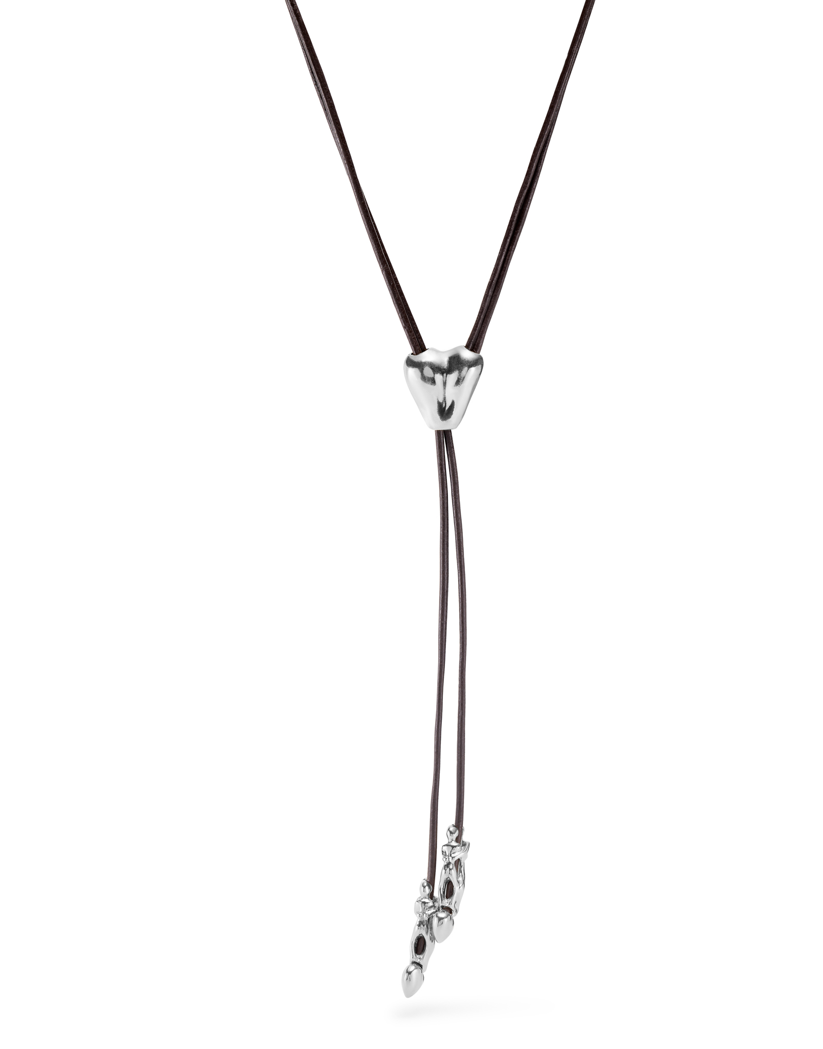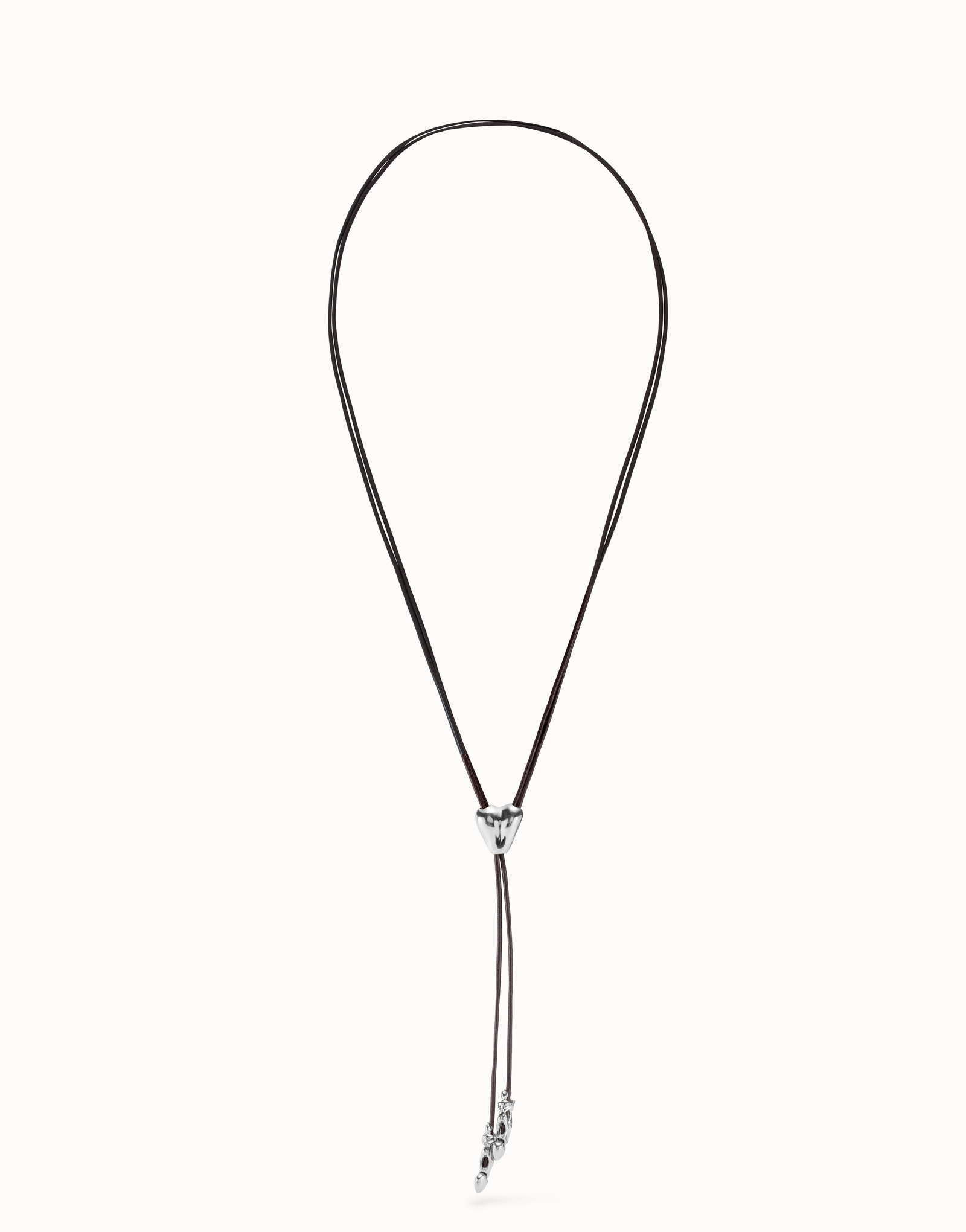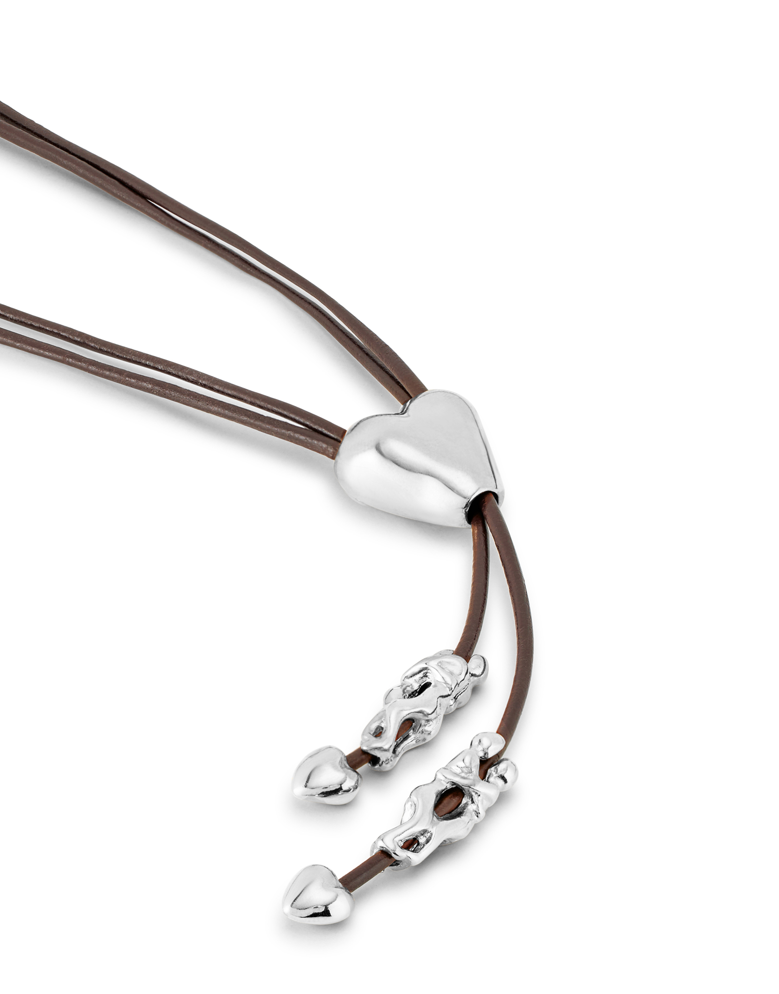 Chaîne en cuir avec des figures plaquées argent et un cœur réglable au centre. Un bijou fabriqué en Espagne selon un procédé 100 % artisanal.