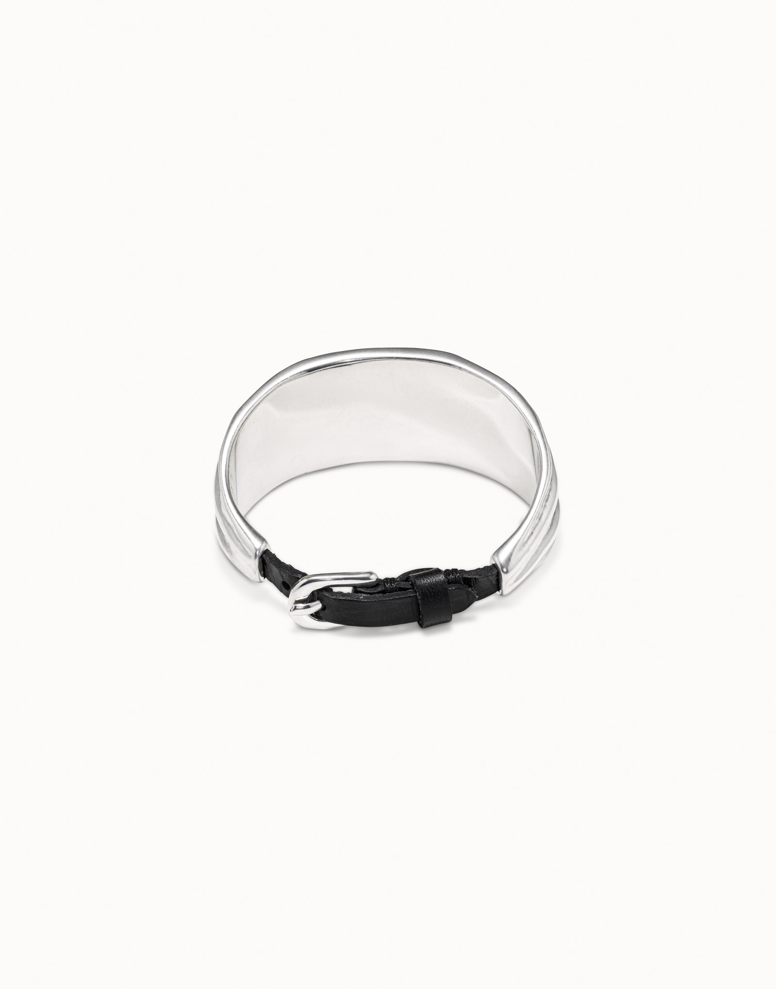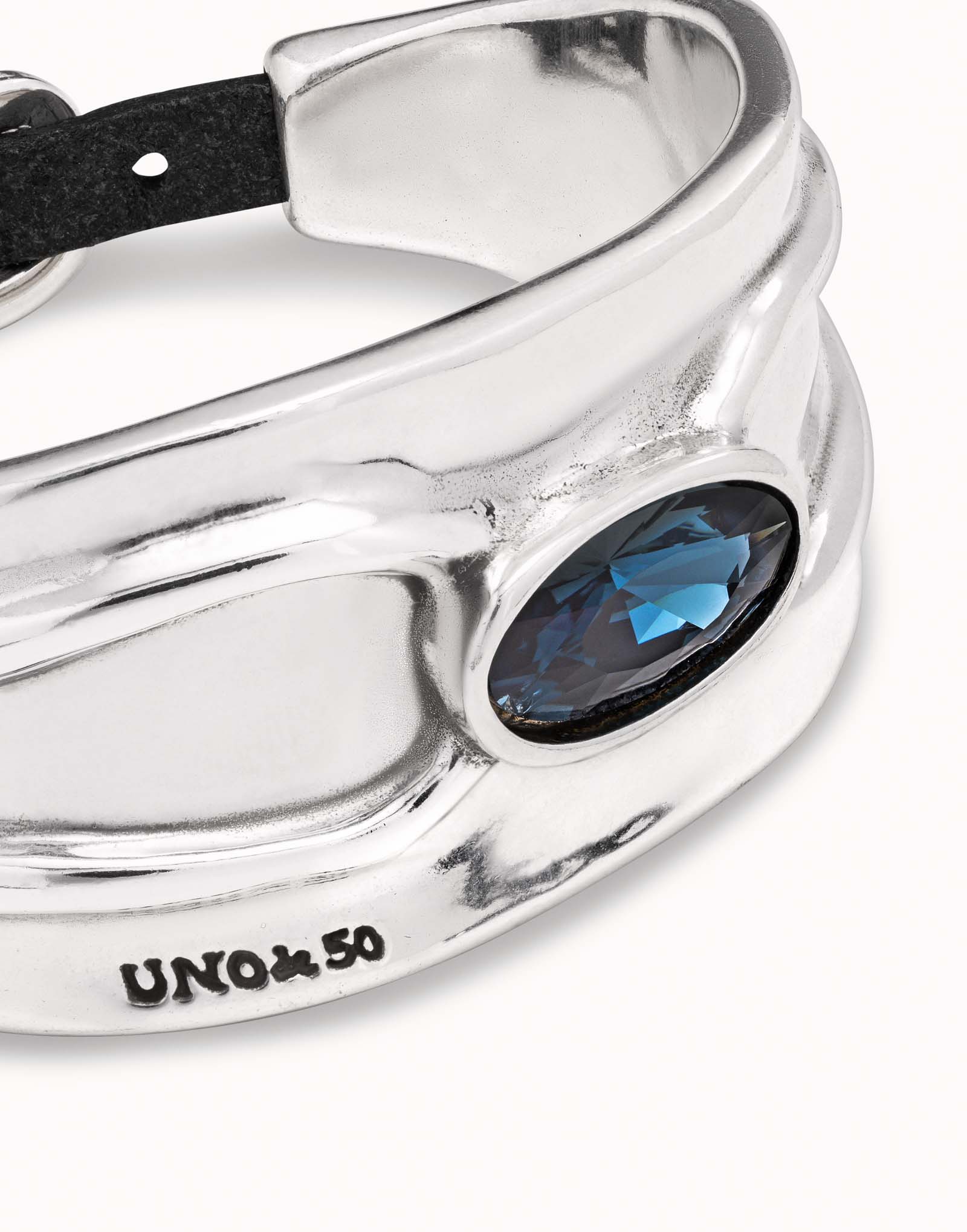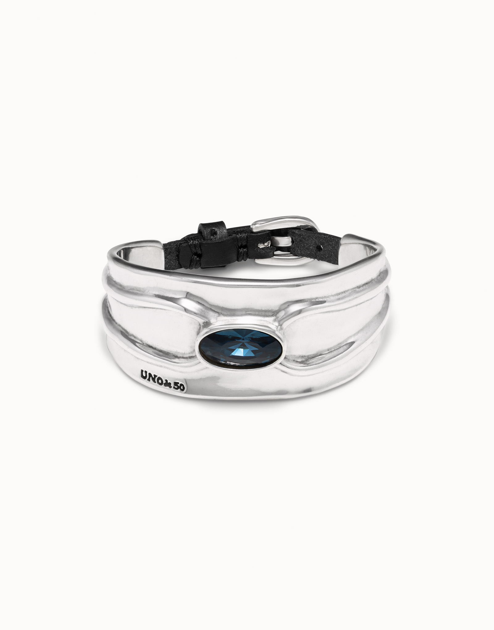 Embossed cuff bracelet with a central blue crystal. It features a unique leather buckle clasp. This bracelet was designed and handmade in Spain using a high-quality silver-plated cast metal. Wear this bracelet every day or save it for those special occasion. Treat yourself to it!