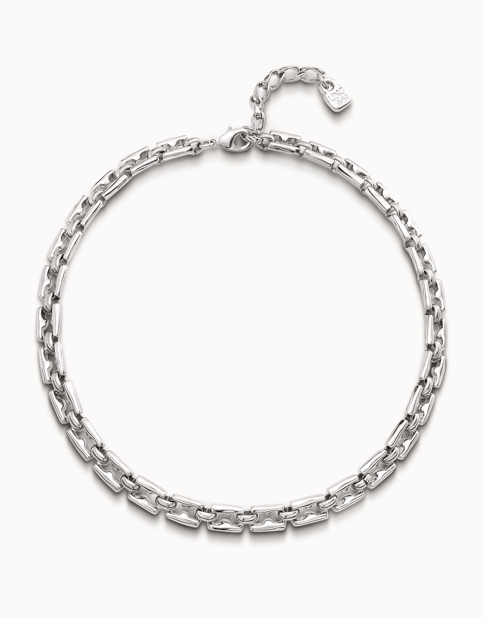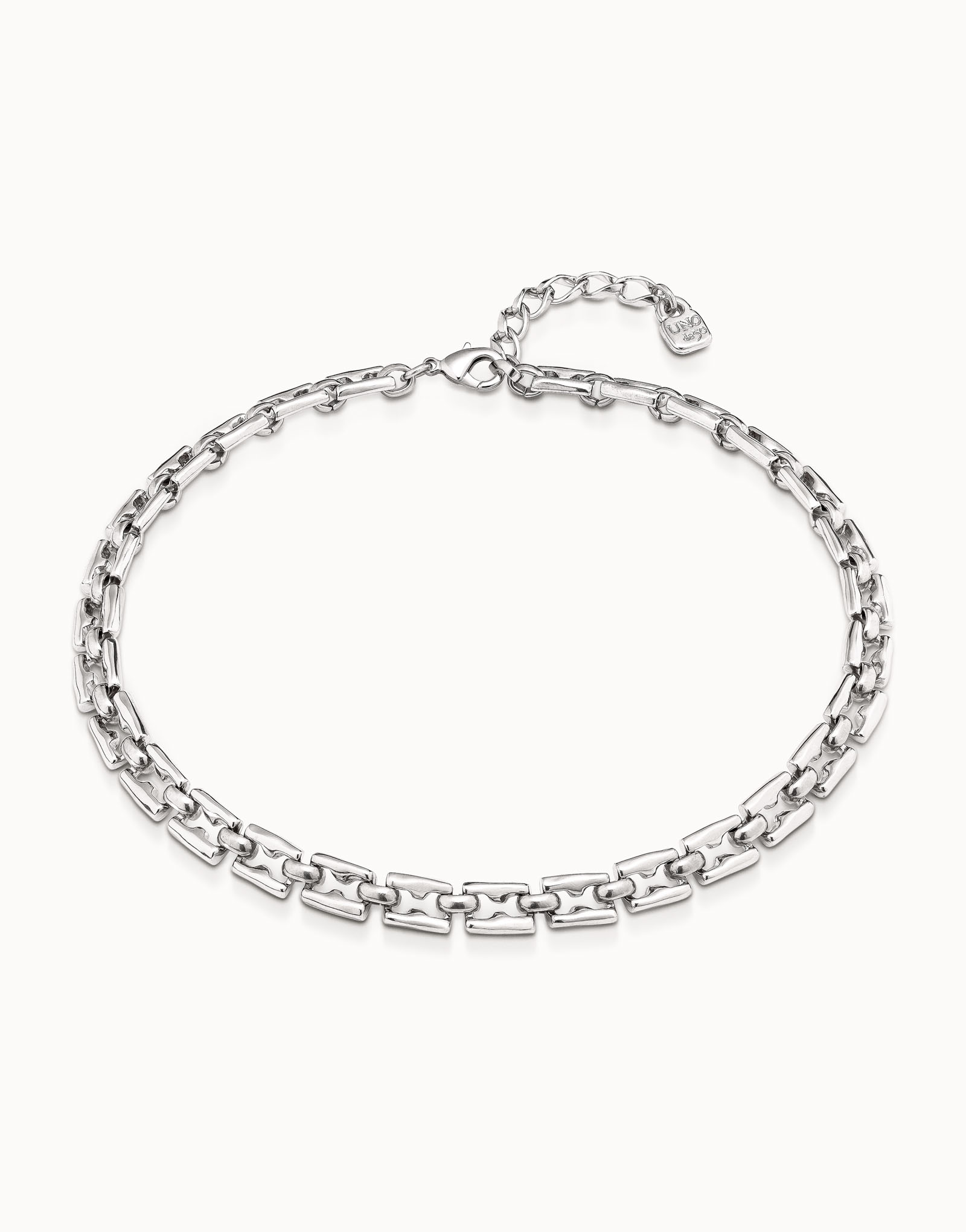 Collar corto con un diseño de eslabones cuadrados pequeños. Dispone de un cierre de mosquetón, que permite regularlo a la medida deseada. Está elaborado en España de manera artesanal, con una aleación de metales fundidos bañados en plata.
